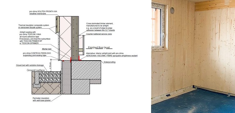 The pro clima database of CAD detail features provides you with a range of suggested solutions for planning and implementing your construction projects. Drawings showing how to achieve airtightness and windtightness at detail features are available here to be downloaded for free in the form of DWG files, DXF files or PDF files. The drawings are grouped by construction type (timber frame and solid timber construction) and by the type of details – for example: base joints, component transitions, pitched roofs, flat roofs, windows and penetrations. A number of variants are available for many of the construction situations.