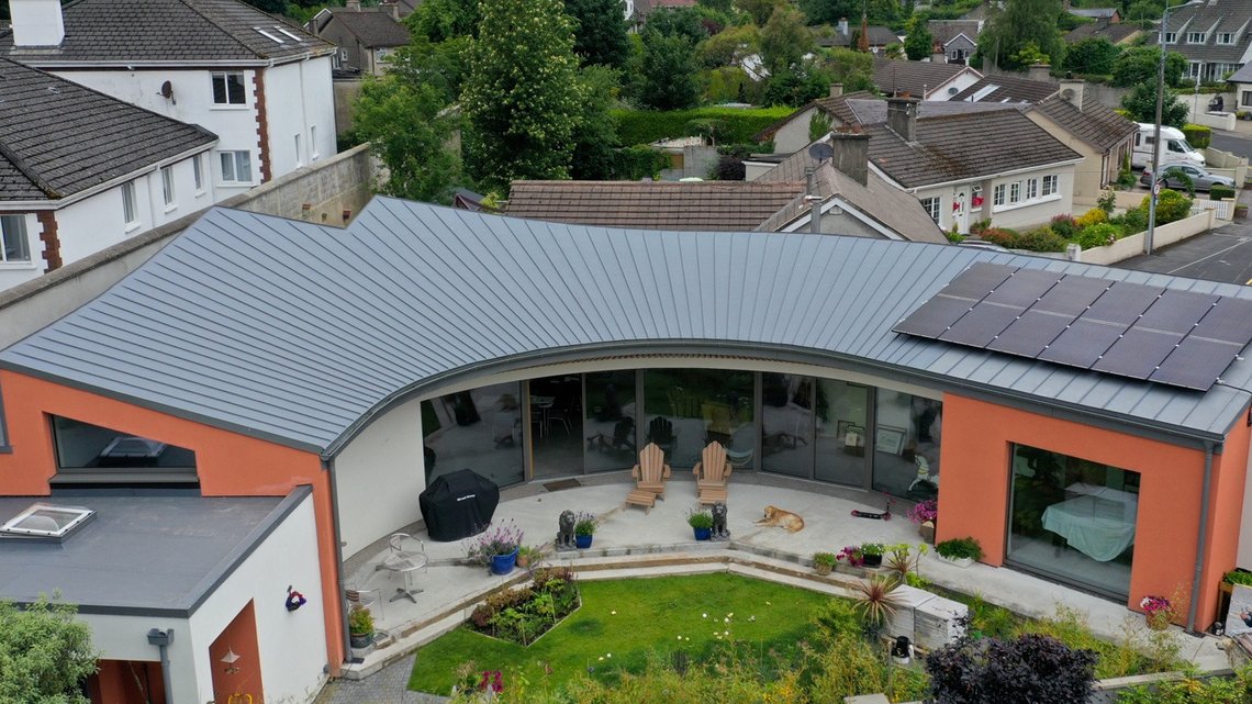 This timber-frame home was a new build on a confined site in a mature, built up suburb of Limerick. The unconventional design by Studiomove Architects has the house wrapped around three sides of the site, with views centred on the east-facing courtyard. A particular feature of this project was the focus on minimal use of resources and on energy efficiency, to attain performance as close to passive house standard as possible. Solar PV panels on the roof provide carbon-neutral electricity . This modern, but understated design of this new build fits in well with the surroundings and the older neighbouring houses.