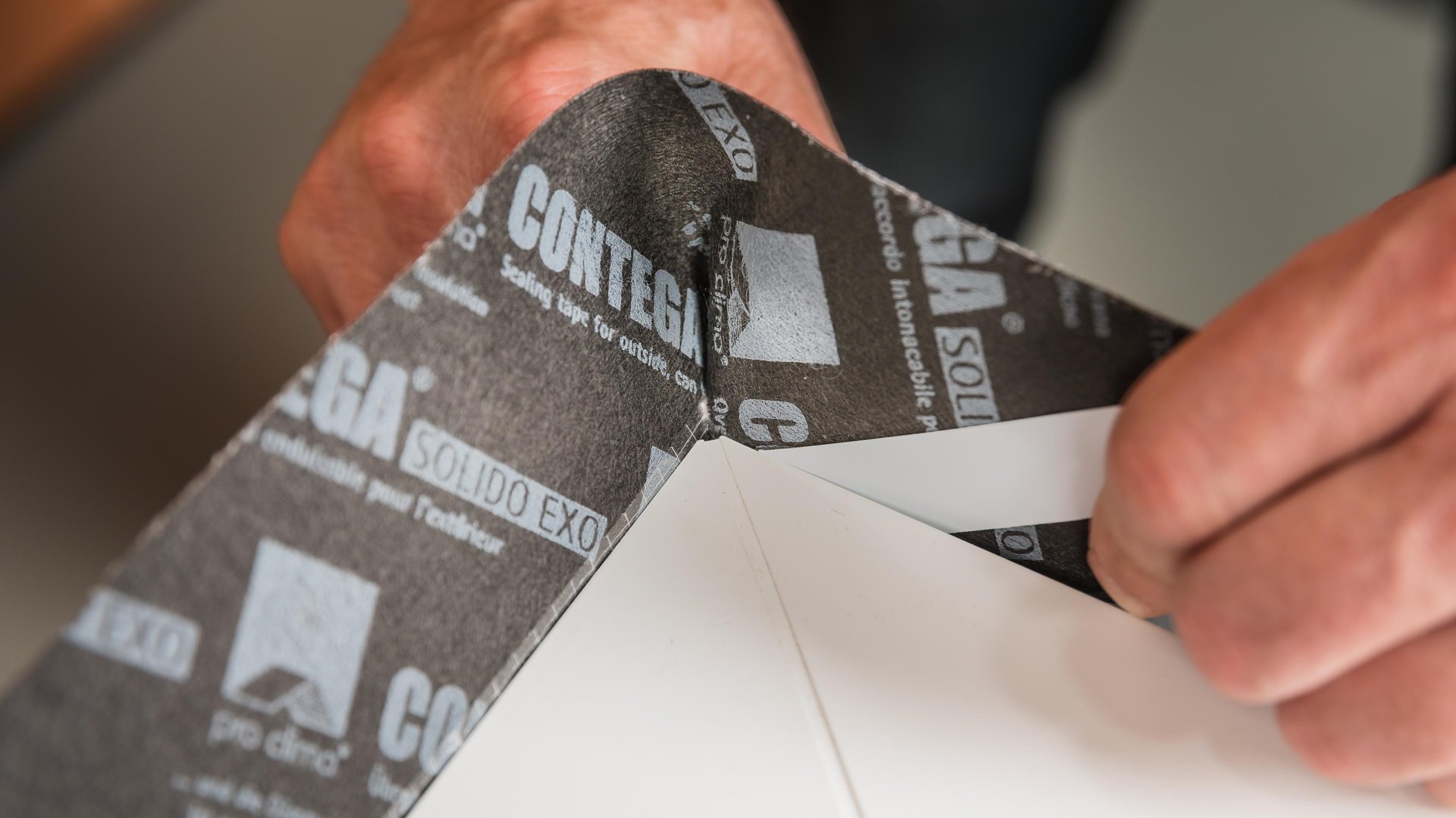 For the joint at bottom of the window, application of CONTEGA SOLIDO EXO-D can be continued onto the front face of the sill connection profile. This makes it easier to mount the window and apply the tape to the sub-sill later. In this case, a length of tape must be applied over the corner fold. This can also be done with all other corner folds. Tape should only be applied onto surfaces that will not be visible in the long term.